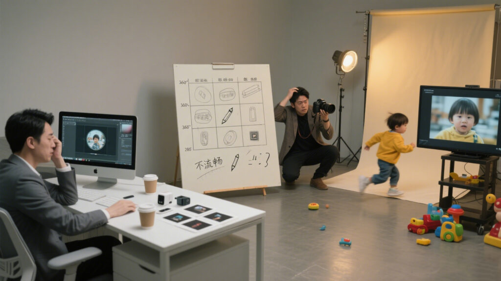 产品360°视频拍了8遍,不是转盘卡顿,就是灯光穿帮,儿童摄影师追着奔跑的孩子,相机抖得像“帕金森”,广告导演对着分镜挠头,多角度镜头怎么都拼不出流畅感…
